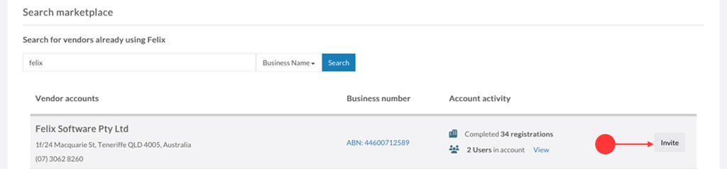 Once you’ve found the correct vendor account, click Invite to invite them to you organisation.