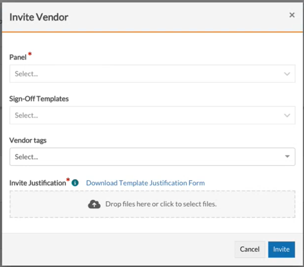 Navigate to Settings > Vendor Settings. Scroll to the bottom and go to Vendor invite justification template file section. Click the dropzone link to attach a file and click the Update button.